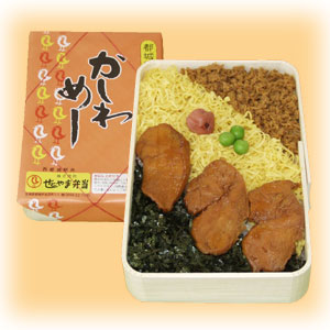この郷土料理を駅弁にアレンジして、昭和30年に発売したのが当店の名物駅弁「かしわめし」弁当です。このかしわめし弁当は正方形の木箱の中に、とりのスープや醤油等で味付けした炊き込みご飯の上に、錦糸玉子、刻み海苔等で美しく飾り、しっかりと味の染みこんだかしわの胸肉を並べています。